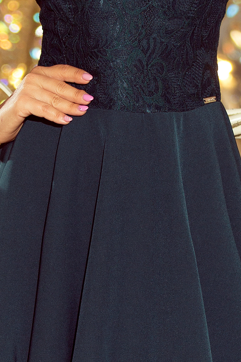 Krótka rozkloszowana elegancka Sukienka z koronką – ZIELEŃ BUTELKOWA
