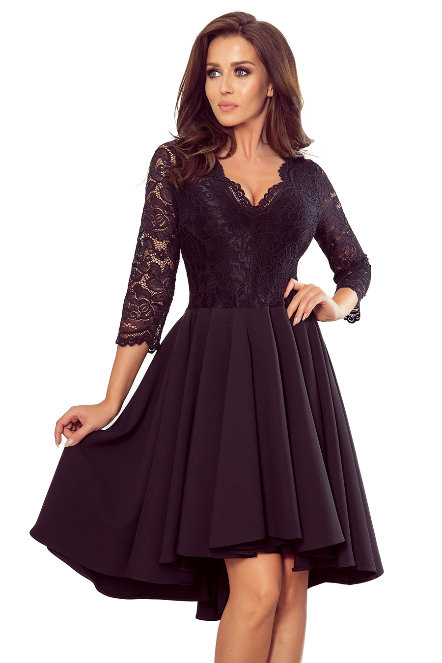 Elegancka sukienka z dłuższym tyłem i koronkowym dekoltem – CZARNA