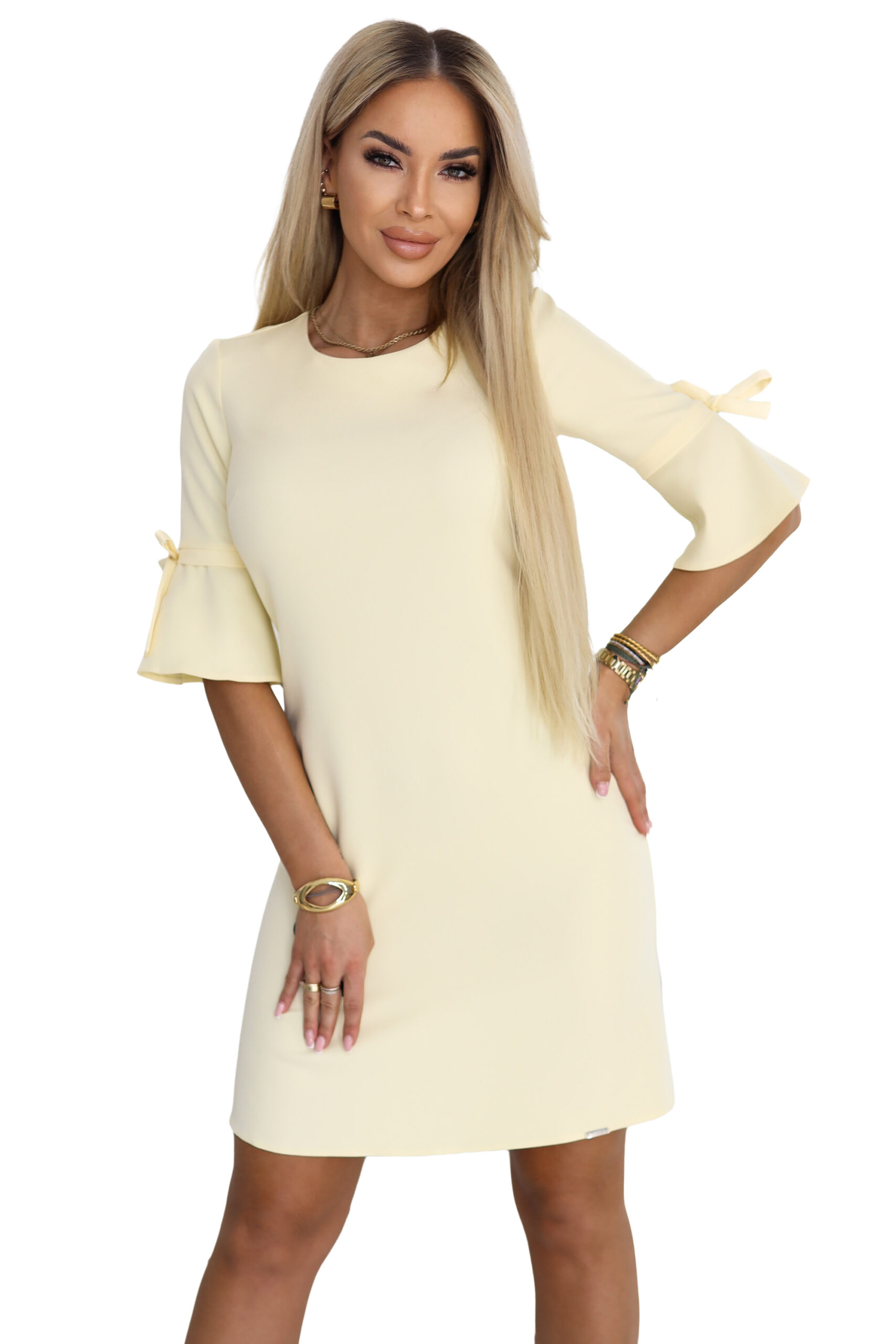 217-12 NEVA Kobieca trapezowa sukienka z wiązaniem na rękawkach – pastelowy żółty