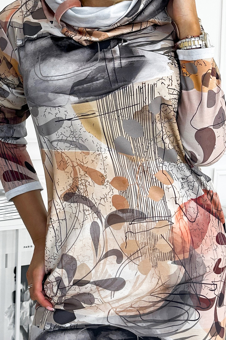 Irene – wygodna sukienka z golfem. Wzór: silver brown. Produkt polski. Wykonana z przyjemnego w dotyku elastycznego materiału. Marka numoco.