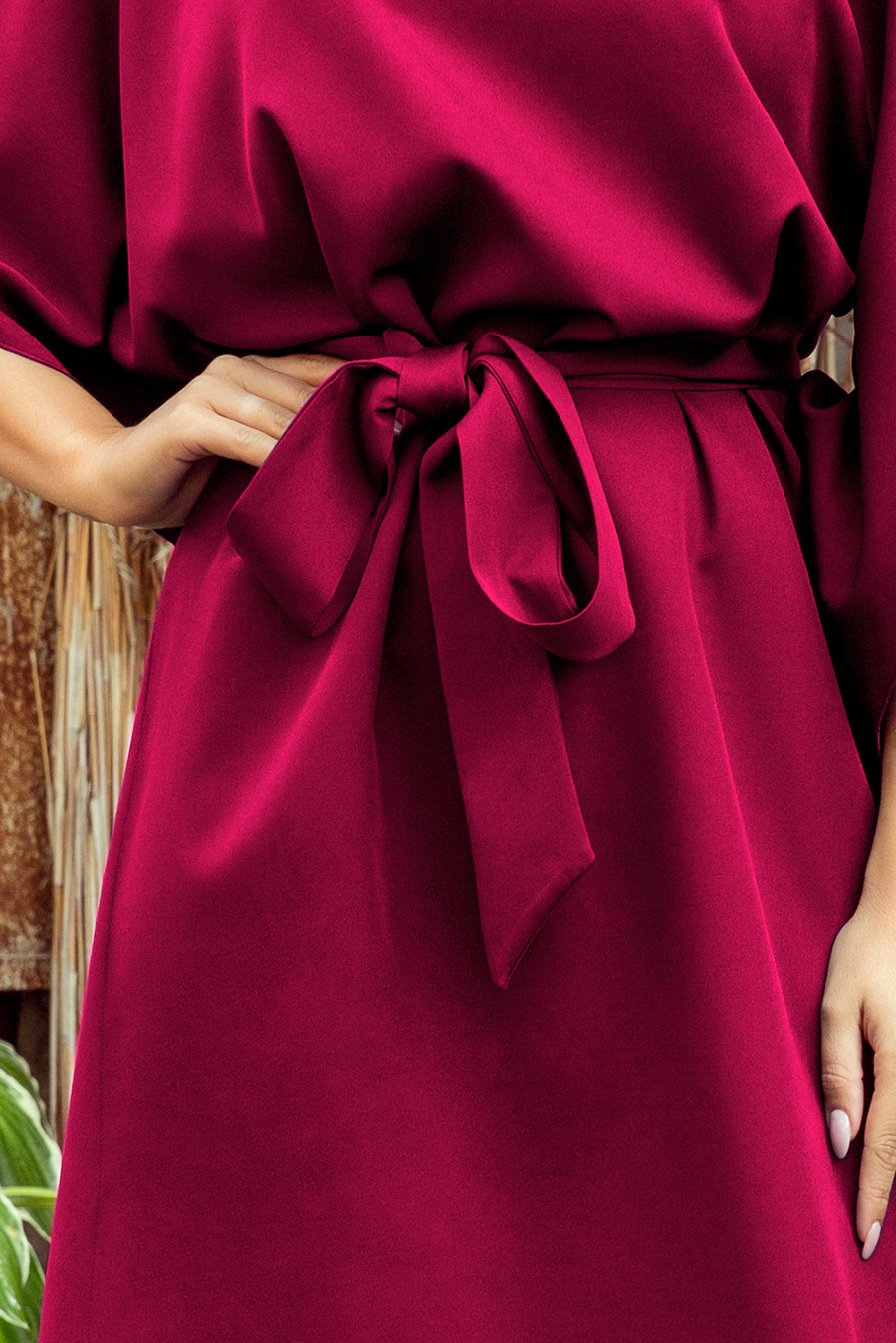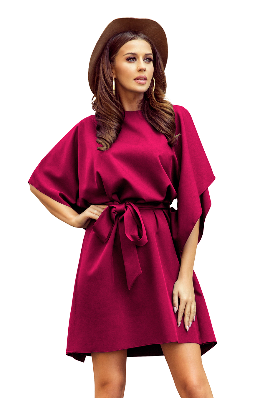 SOFIA Sukienka typu motyl z paskiem – kolor bordowy. Uszyta z przyjemnego w dotyku materiału. Marka numoco. Produkcja polska.