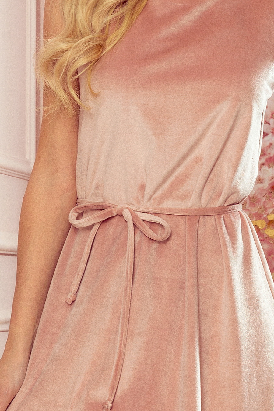 Victoria – luźna trapezowa sukienka z paskiem. Uszyta z welurowego materiału w kolorze brudnego różu. Marka numoco. Produkcja polska.