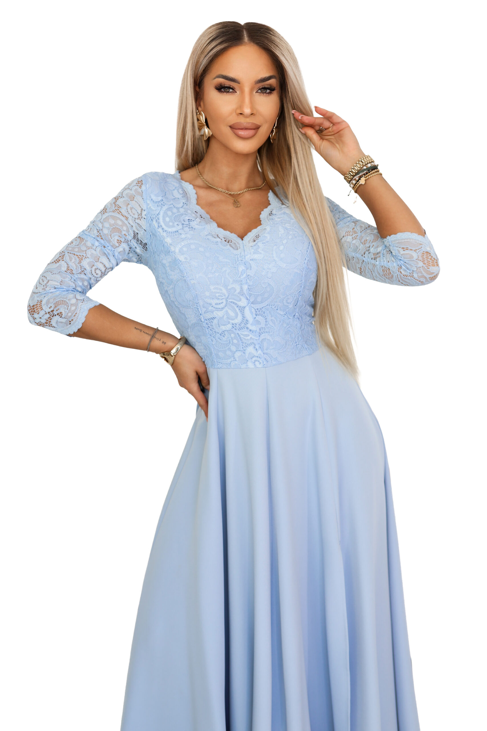 309-15 AMBER elegancka długa koronkowa suknia z dekoltem – błękitna