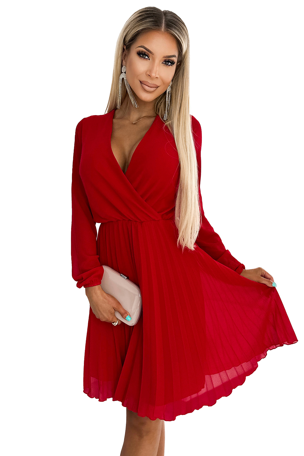 Plisowana sukienka z długim rękawkiem i kopertowym dekoltem – CZERWONA