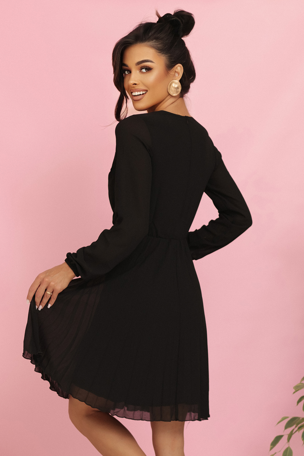 313-17 ISABELLE Polska plisowana sukienka z długim rękawem i dekoltem – CZARNA