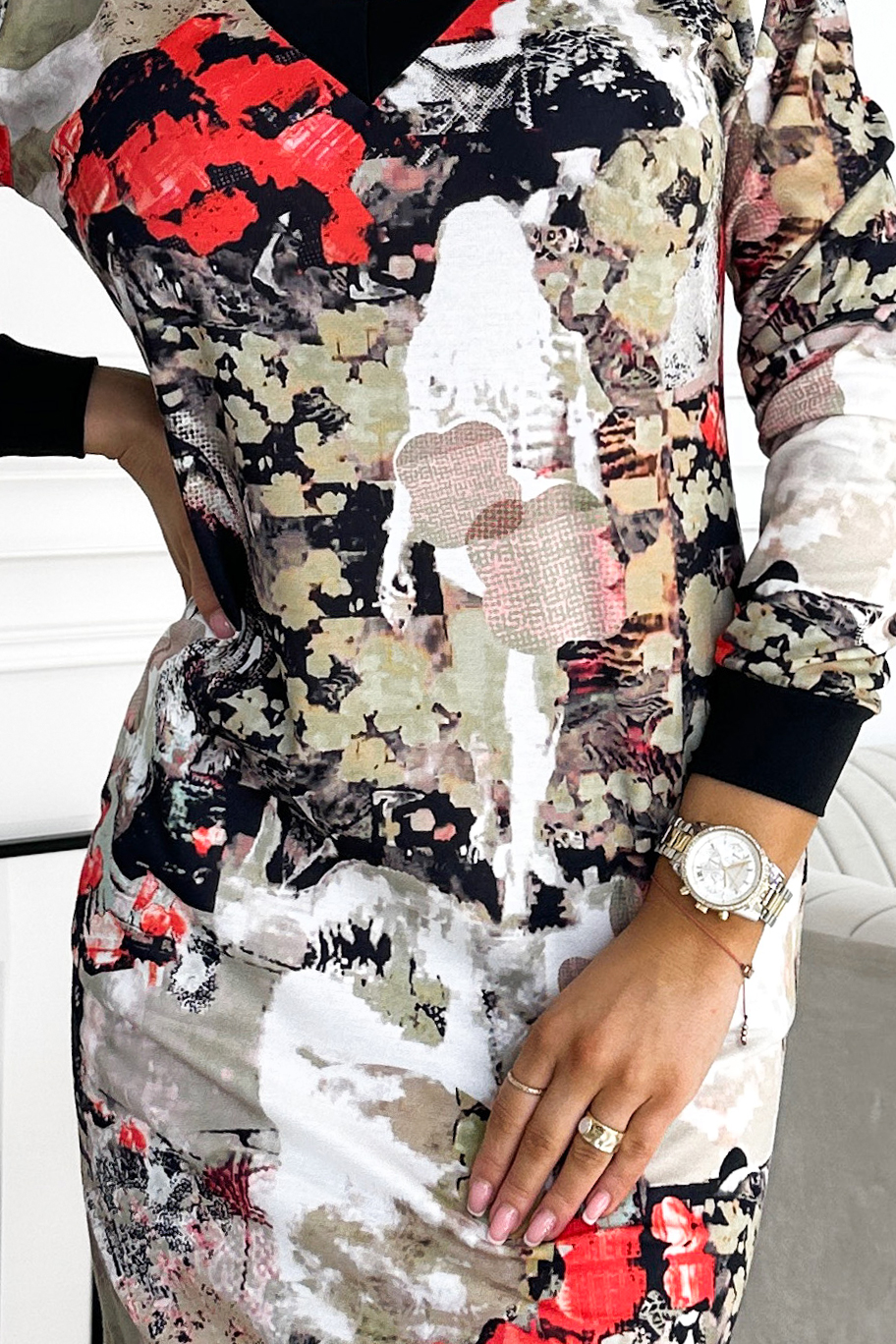 Wygodna Sukienka z dekoltem i długim rękawkiem – kolorowy wzór