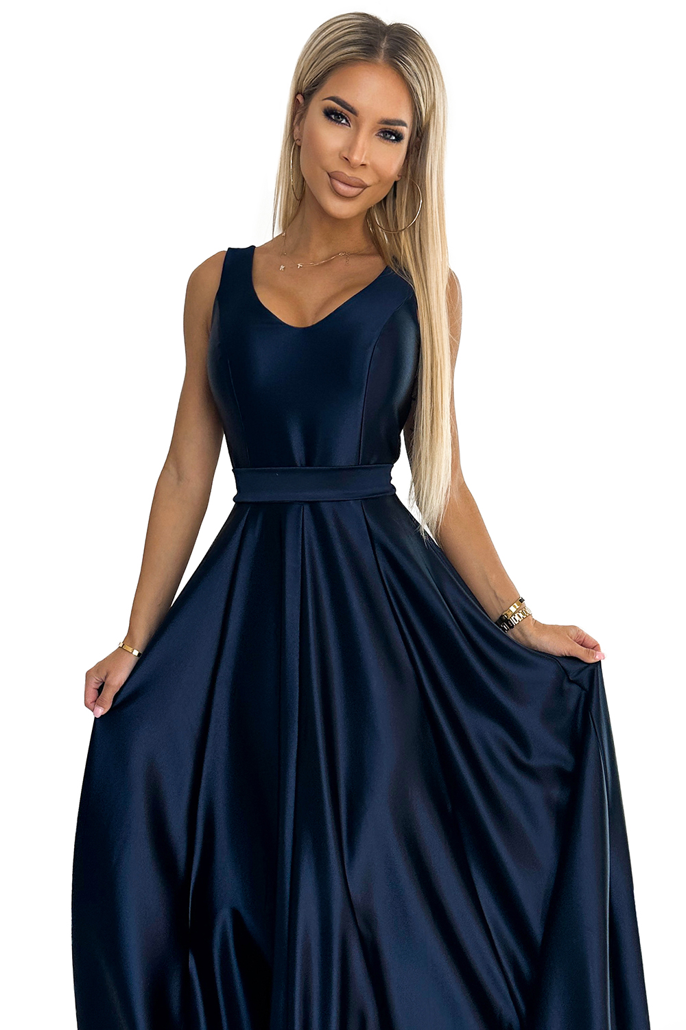Cindy – długa satynowa maxi suknia z dekoltem i kokardą. Uszyta z przyjemnego w dotyku, połyskującego materiału w modnym granatowym kolorze. Zapinana z tyłu na kryty zamek. Produkt polski. Marka numoco.