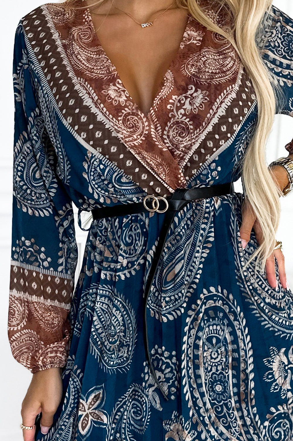 Szyfonowa plisowana sukienka midi z dekoltem, długim rękawkiem i czarnym paskiem. Wzór: niebieski z brązem. Marka numoco basic. Produkcja europejska.