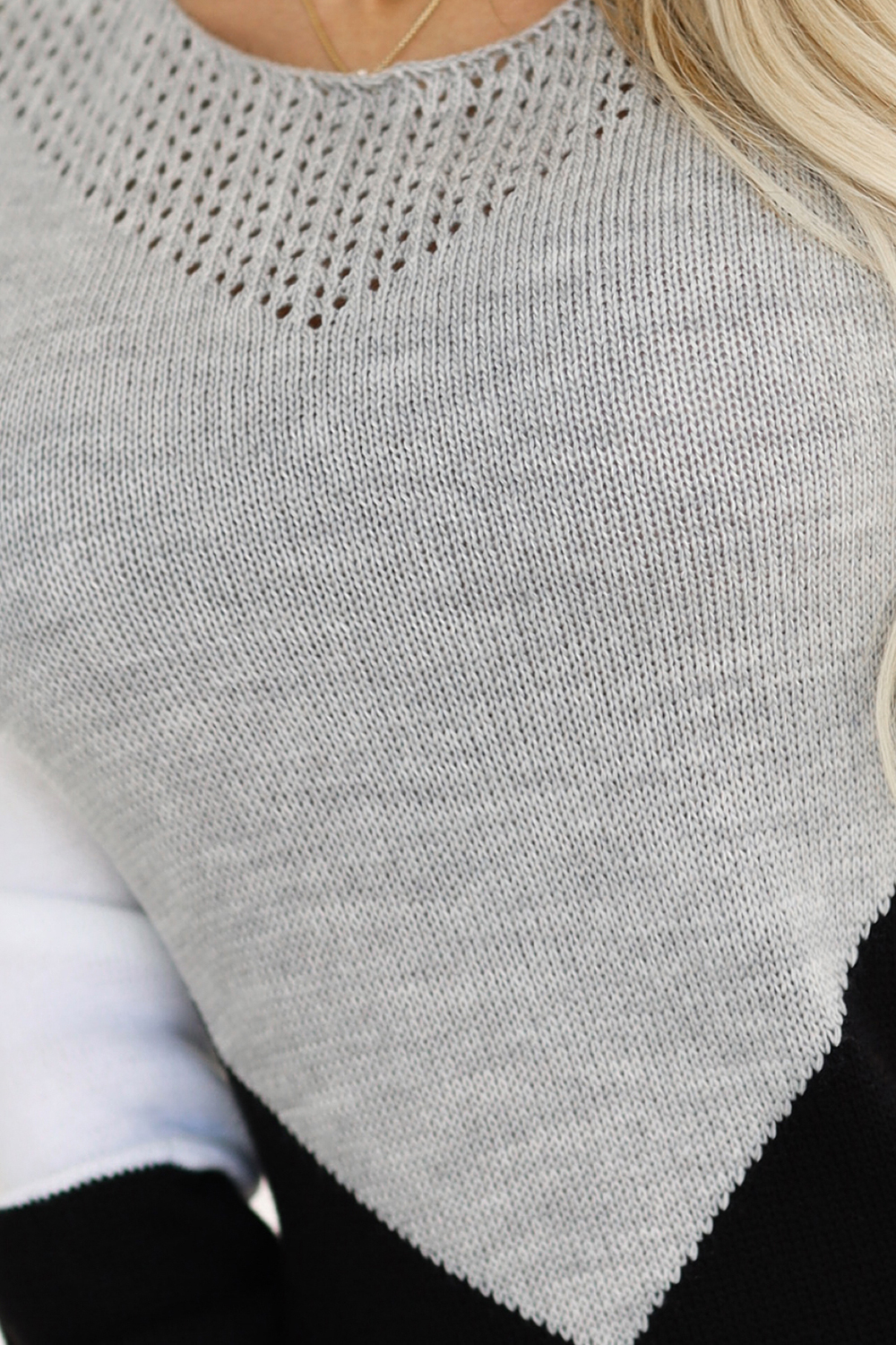 584-1 Trójkolorowa sweterkowa sukienka z ażurowym dekoltem – czarno-biało-szara