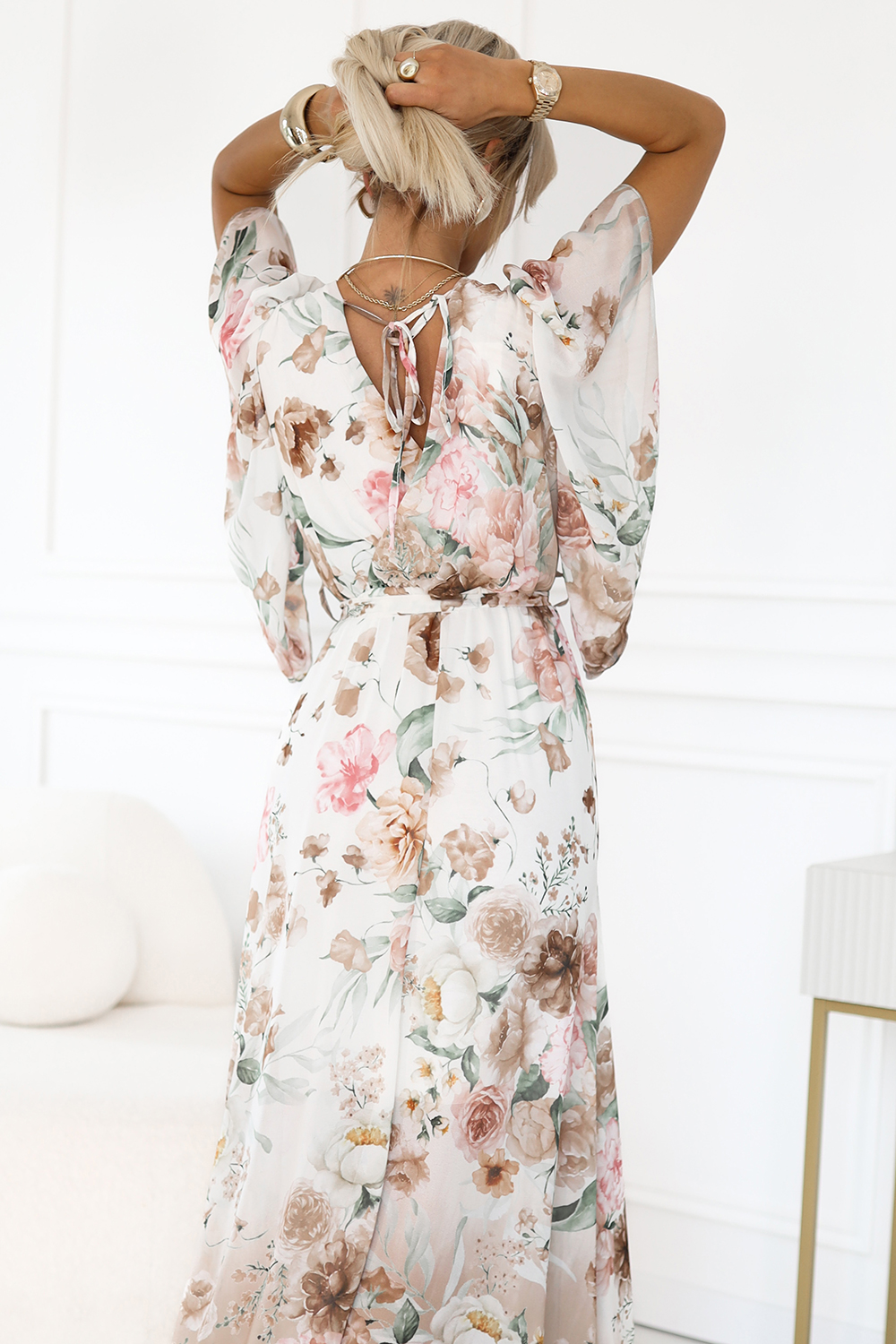 Elegancka sukienka maxi z motywem kwiatowym w odcieniach beżu i różu