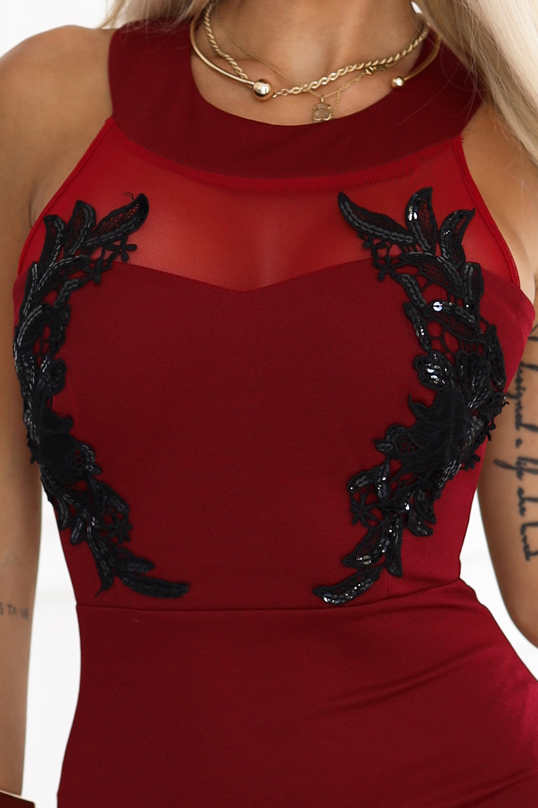 617-2 Długa suknia syrenka z czarną koronką i siateczką – bordowa