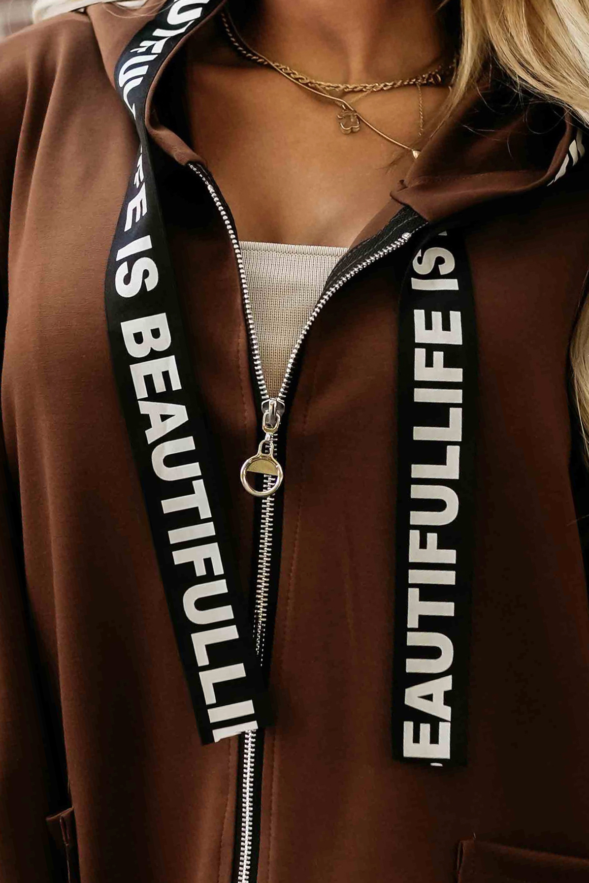 Odkryj nowoczesny styl i wygodę – płaszczyk damski marki Numoco Basic to idealne połączenie casualowego luzu i modnych detali. Uszyty w Europie z dbałością o każdy szczegół, zachwyca efektownymi napisami BEAUTIFUL LIFE na taśmach przy kapturze oraz funkcjonalnym zamkiem błyskawicznym.