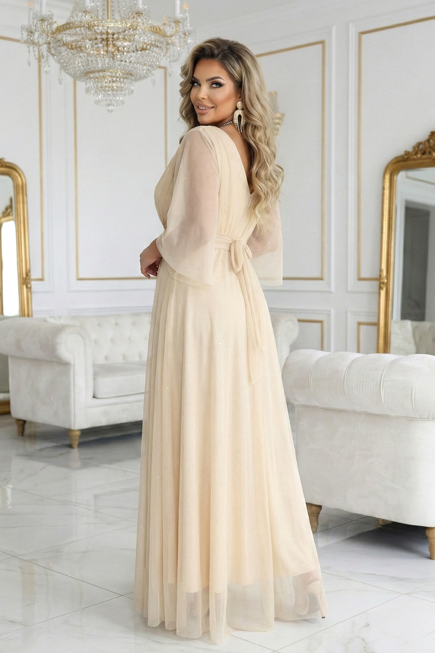 654-2 Długa połyskująca sukienka plus size z dekoltem i transparentnym rękawkiem – szampański beż