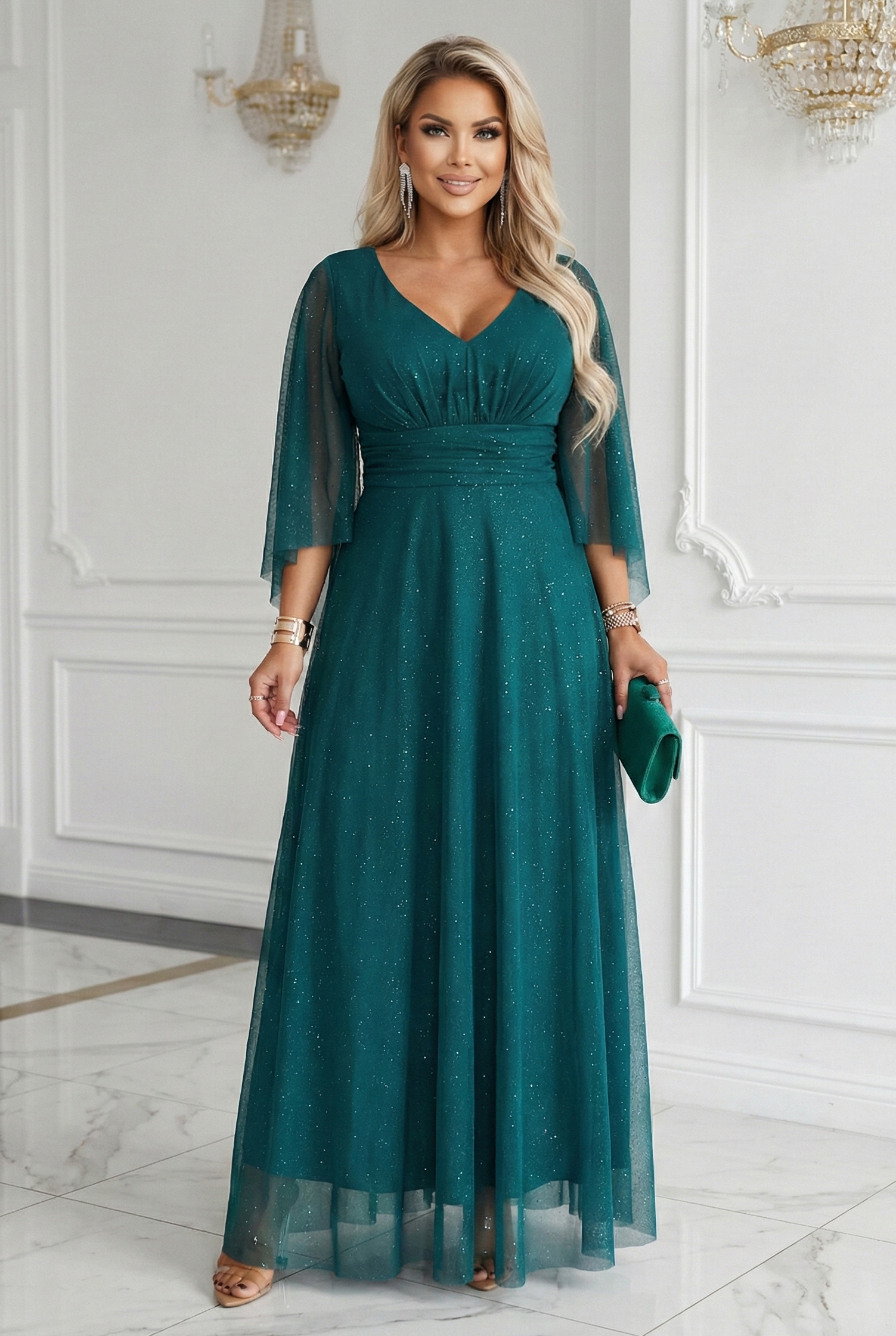 655-2 Długa połyskująca w świetle suknia z dekoltem i transparentnym rękawkiem – szmaragdowa zieleń