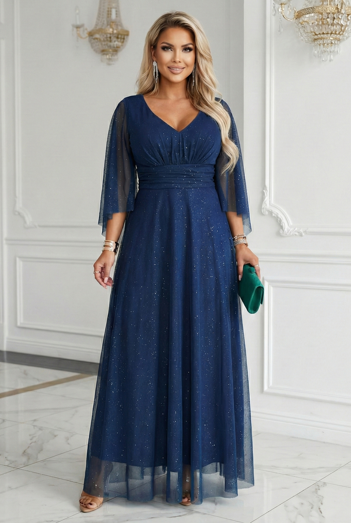 Lekko połyskujący materiał z delikatnym brokatem tworzy efekt „gwiezdnego blasku”, który pięknie prezentuje się w wieczornym świetle. Kopertowy dekolt V wysmukla szyję i optycznie modeluje górę sylwetki, a szeroki, stabilny pas w talii nadaje figurze proporcji. To szczególnie ważne dla kobiet szukających wieczorowej sukienki plus size, która faktycznie poprawia linię talii.