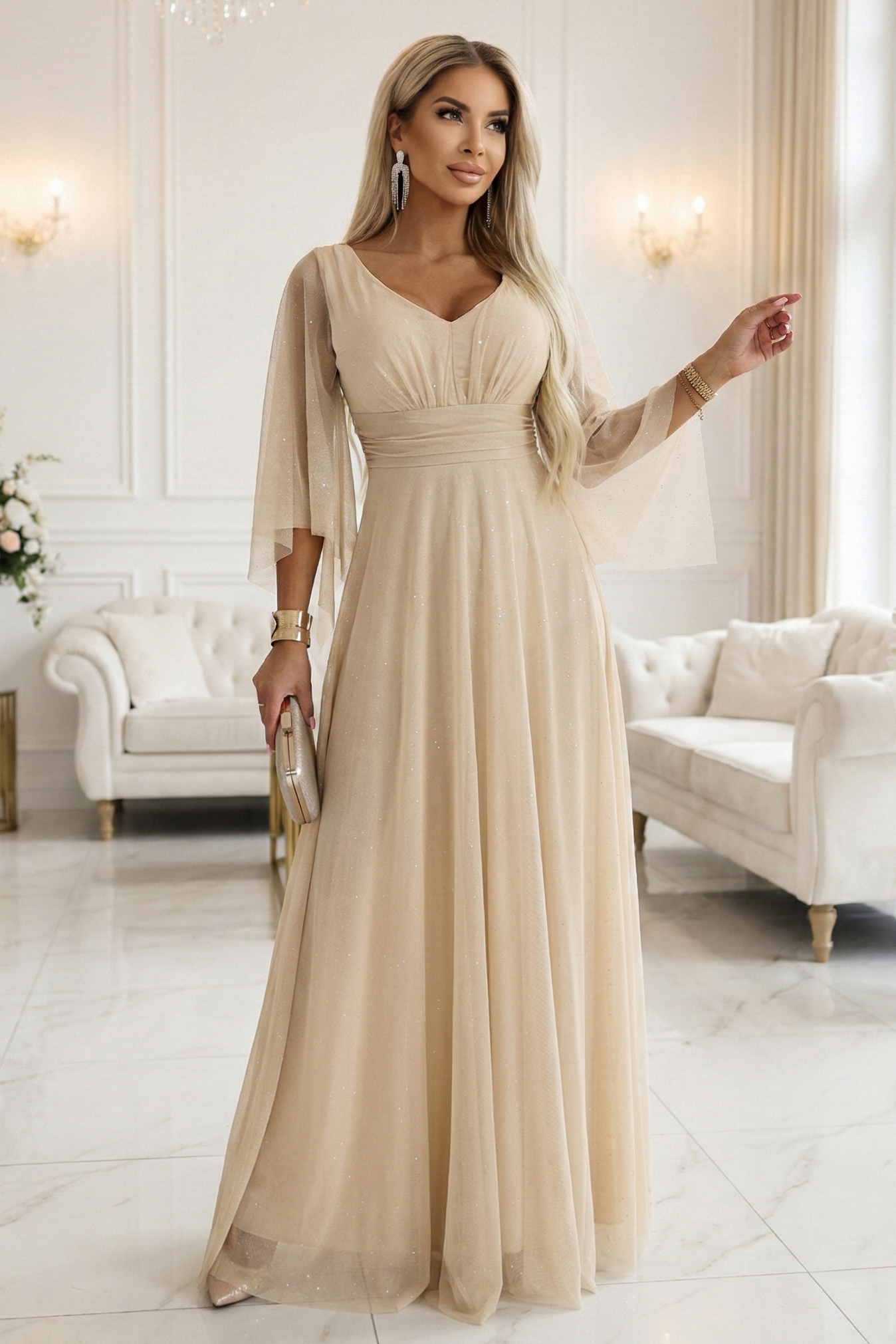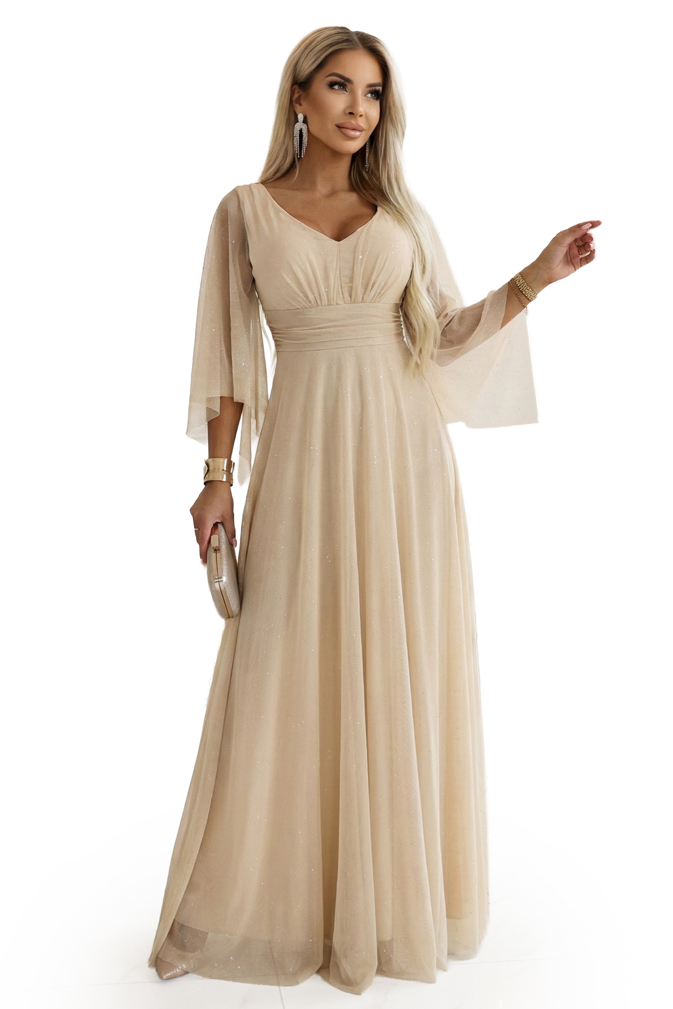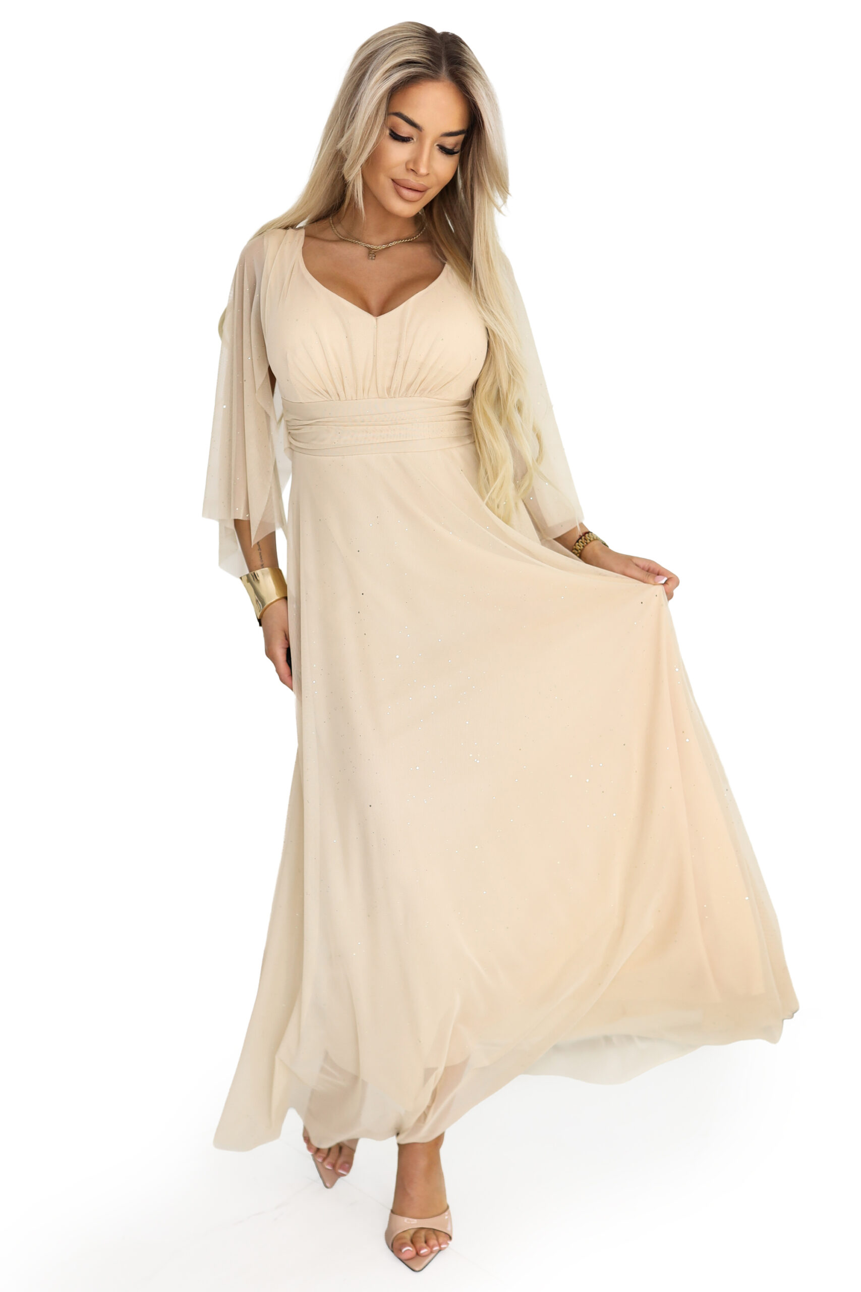 655-4 Długa połyskująca w świetle suknia z dekoltem i transparentnym rękawkiem – szampański beż