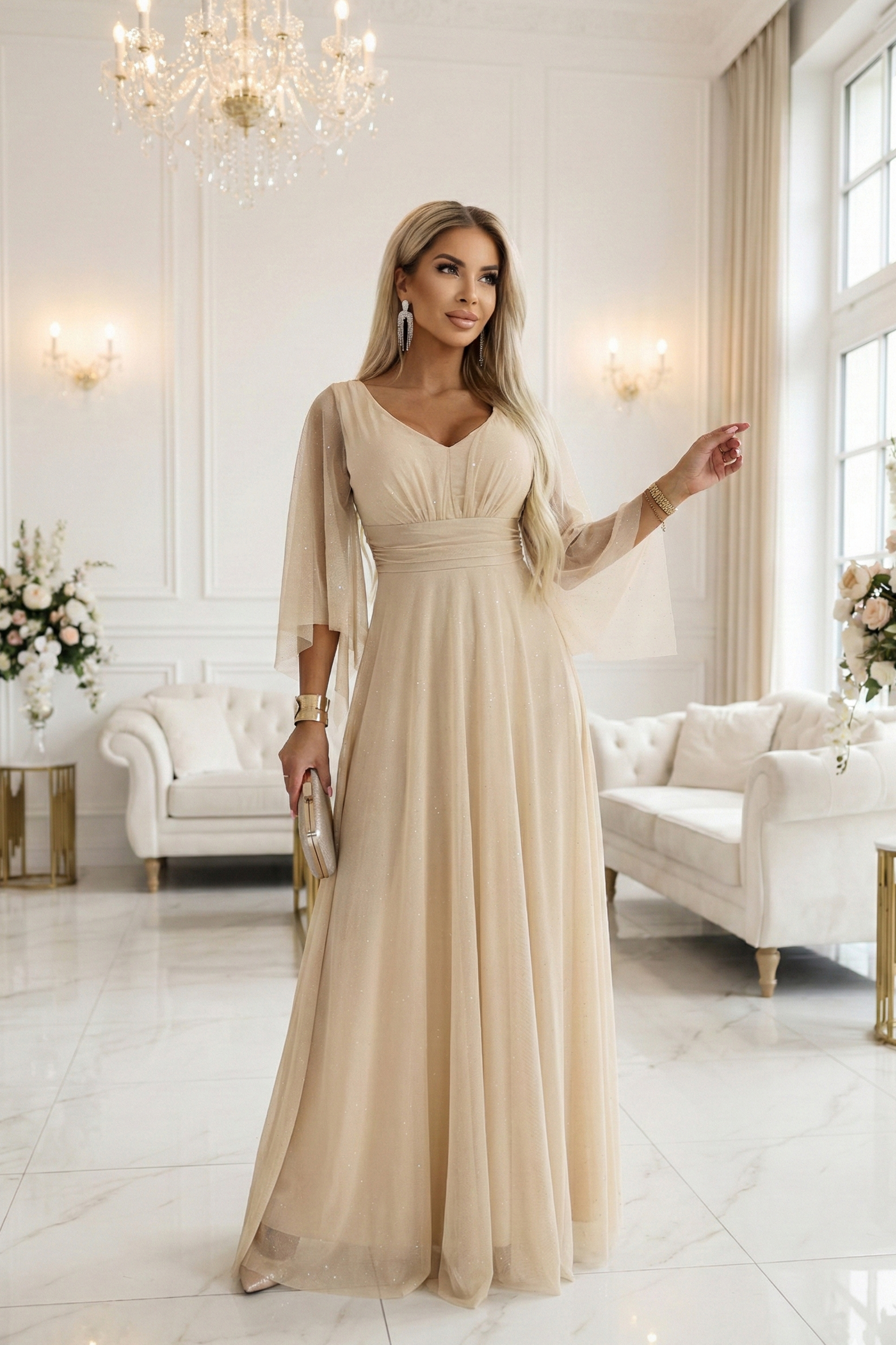 Są kreacje, które nie potrzebują głośnych dodatków, by robić wrażenie. Ta sukienka maxi w odcieniu szampańskiego beżu działa jak dopracowany detal w luksusowym wnętrzu: subtelnie przyciąga uwagę, a potem zostaje w pamięci. Delikatnie rozświetlona tkanina łapie światło przy każdym kroku, tworząc efekt miękkiego glamour, idealny na wyjątkowe wyjścia.