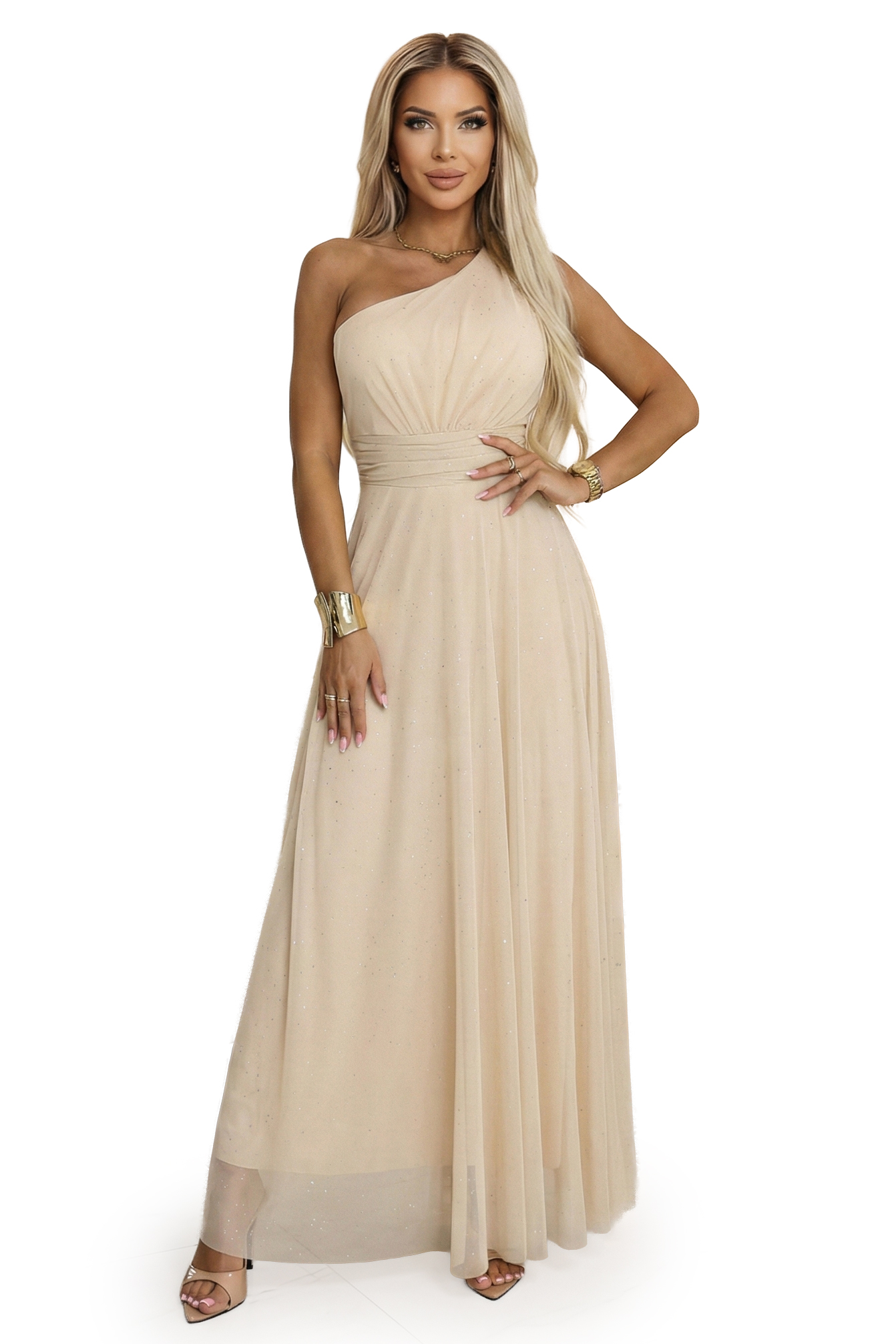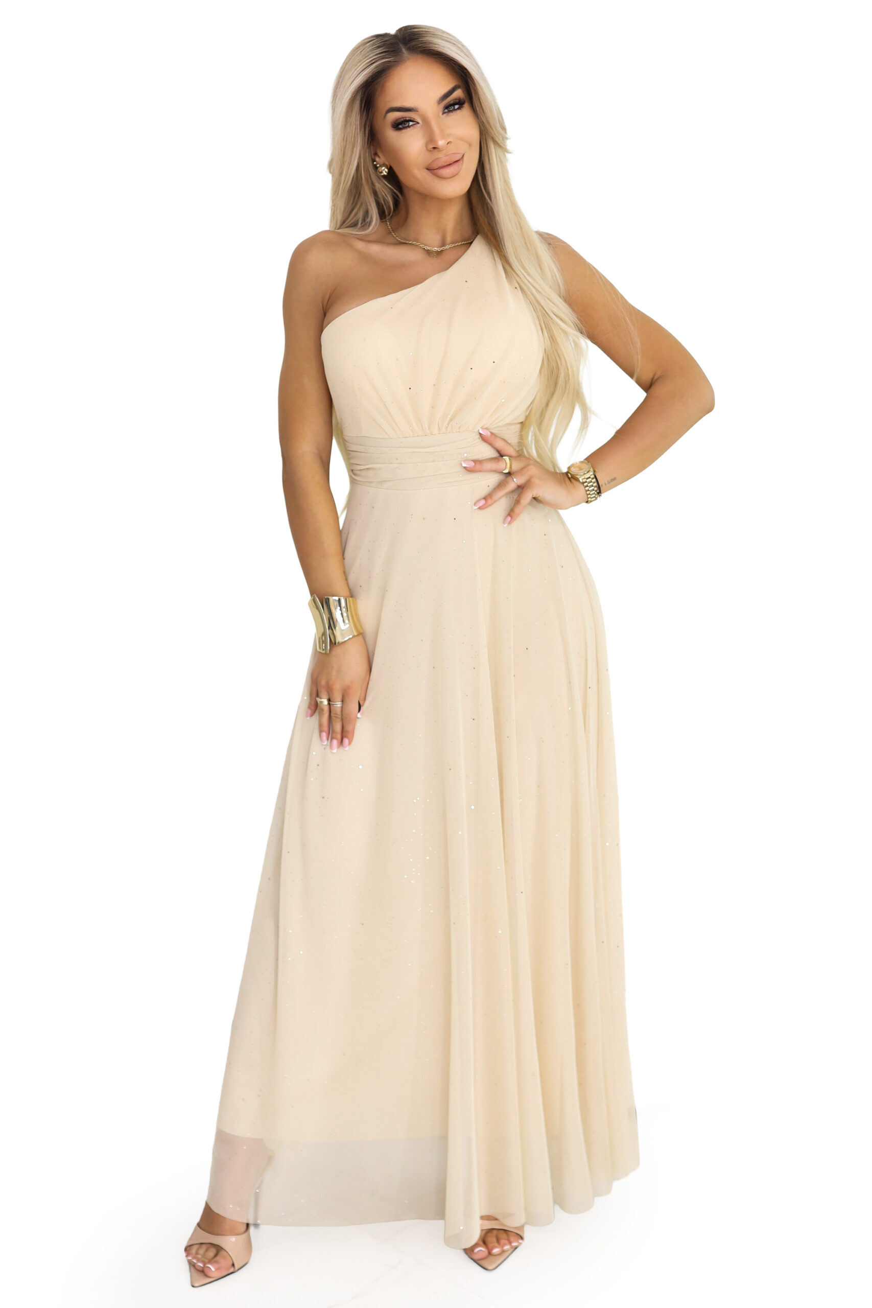 656-2 Długa błyszcząca suknia wieczorowa na jedno ramię – szampański beż