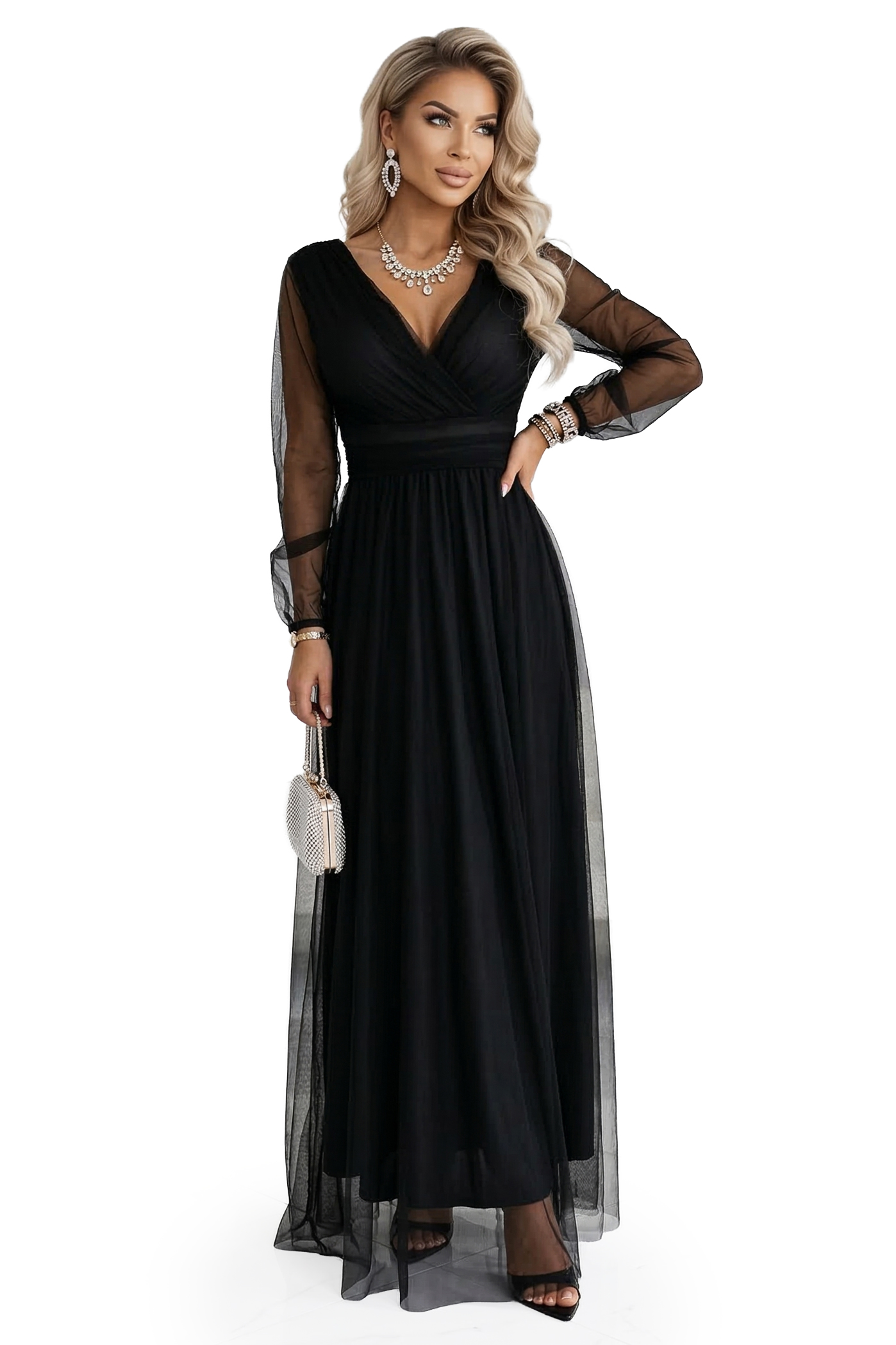 664-3 Długa sukienka maxi z tiulowymi rękawami i kopertowym dekoltem – czarna