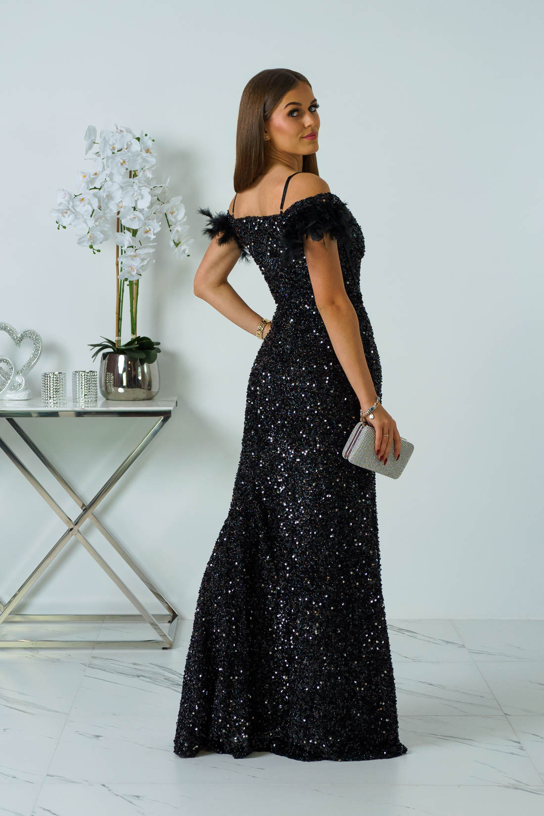 cekinowa sukienka hiszpanka maxi z piórami czarna