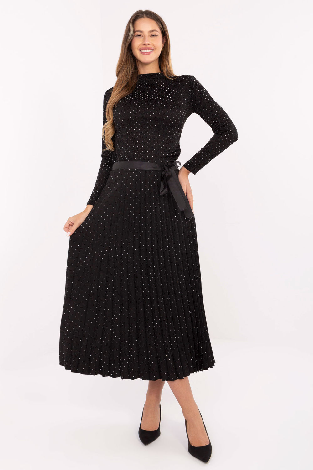 Stylowa i kobieca spódnica plisowana o długości midi, wykonana z wysokiej jakości wiskozy z dodatkiem elastanu, zapewniającej lekkość, przewiewność i komfort noszenia. Model posiada elastyczną gumę w pasie, dzięki czemu idealnie dopasowuje się do sylwetki i nie wymaga zapięcia. Dodatkowym atutem jest pasek w formie szarfy do wiązania, który pozwala podkreślić talię i nadaje stylizacji elegancki charakter. Całą powierzchnię materiału zdobią błyszczące dżety, które subtelnie odbijają światło, dodając spódnicy wyjątkowego uroku i szyku. To doskonała propozycja na okazje wizytowe, spotkania rodzinne czy eleganckie wyjścia zawsze wtedy, gdy chcesz wyglądać stylowo i z klasą.