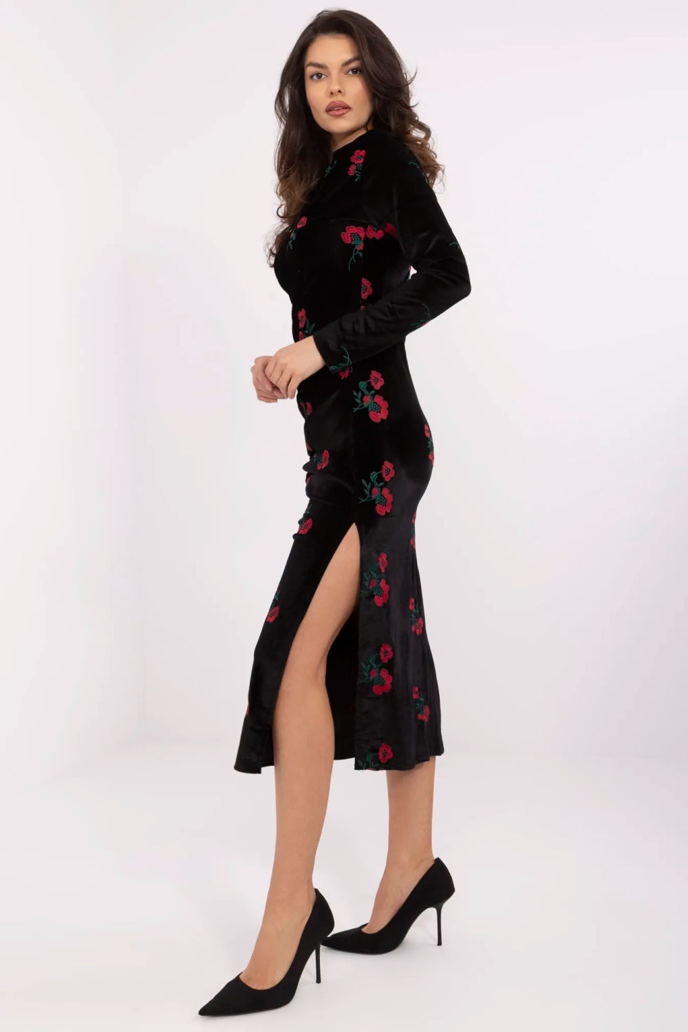 Elegancka sukienka wieczorowa o ołówkowym kroju, która podkreśla kobiecą sylwetkę i dodaje szyku każdej stylizacji. Wykonana z wysokiej jakości mieszanki bawełny, poliestru i elastanu, zapewnia wygodę oraz idealne dopasowanie. Haftowane kwiaty nadają sukience wyjątkowego, romantycznego charakteru, a ozdobne marszczenia subtelnie modelują figurę. Długość midi oraz długie rękawy sprawiają, że kreacja prezentuje się niezwykle stylowo i elegancko. Nietypowy dekolt dodaje oryginalności, podkreślając szyję i ramiona. Brak zapięcia sprawia, że sukienka jest wygodna w zakładaniu. To doskonały wybór na wizytowe okazje, wytworne przyjęcia czy eleganckie wieczory.